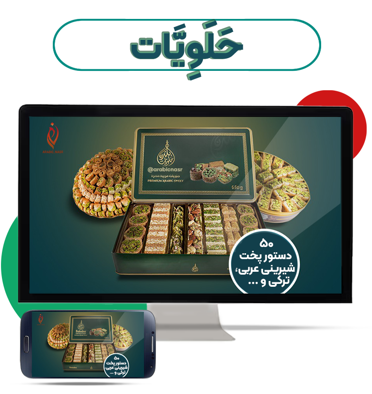صفر تا صد 50 دستور پخت شیرینی به همراه متن عربی و ترجمه - انواع باقلوا، دسر، دهین، کیک، موس شکلاتی، کیک یخچالی، کنافه، قطایف و…..